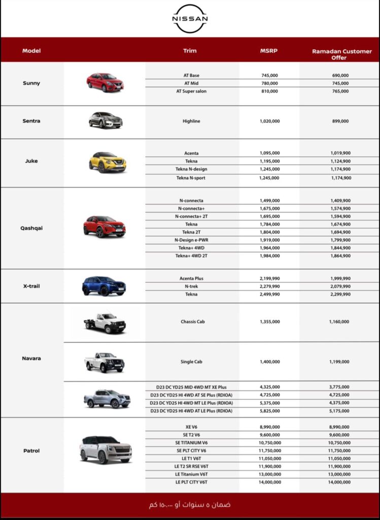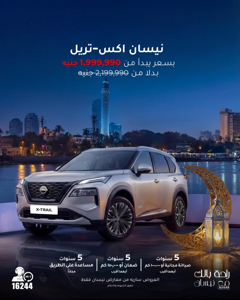 - نيسان اكس-تريل (X-Trail): تبدأ من 1,999,990 جنيه بدلاً من 2,199,990 جنيه.