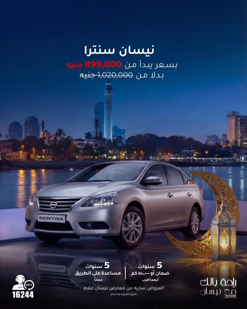 - نيسان سنترا (Sentra): تتوفر بسعر 899,000 جنيه بدلاً من 1,020,000 جنيه.