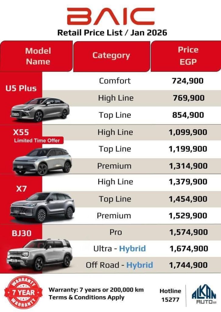 أعلنت شركة “ألكان أوتو” عن تقديم عرض لفترة محدودة (Limited Time Offer) على سيارتها الرياضية متعددة الاستخدامات BAIC X55، شملت تخفيضات سعرية قوية تهدف لتعزيز تنافسية السيارة في السوق المصري مع بداية عام 2026.