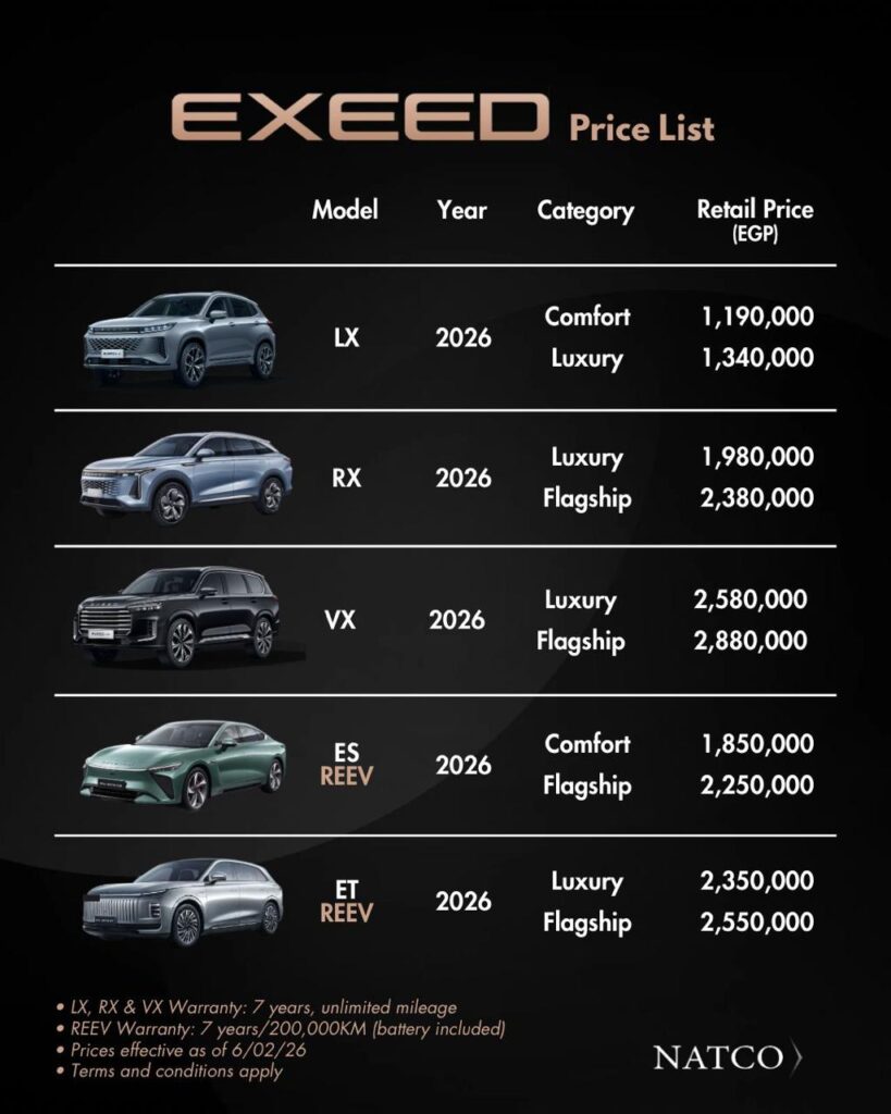 أعلنت شركة “ناتكو” (NATCO)، الوكيل الرسمي لعلامة “إكسييد” (EXEED) الفاخرة في مصر، عن أحدث قائمة أسعار لموديلات عام 2026. وشهدت القائمة الجديدة مفاجأة لراغبي اقتناء الفئات العليا، حيث تم تخفيض سعر طراز VX بقيمة 100 ألف جنيه مقارنة بالأسعار السابقة، في خطوة لتعزيز تنافسية السيارة في فئة الـ SUV العائلية الفاخرة.